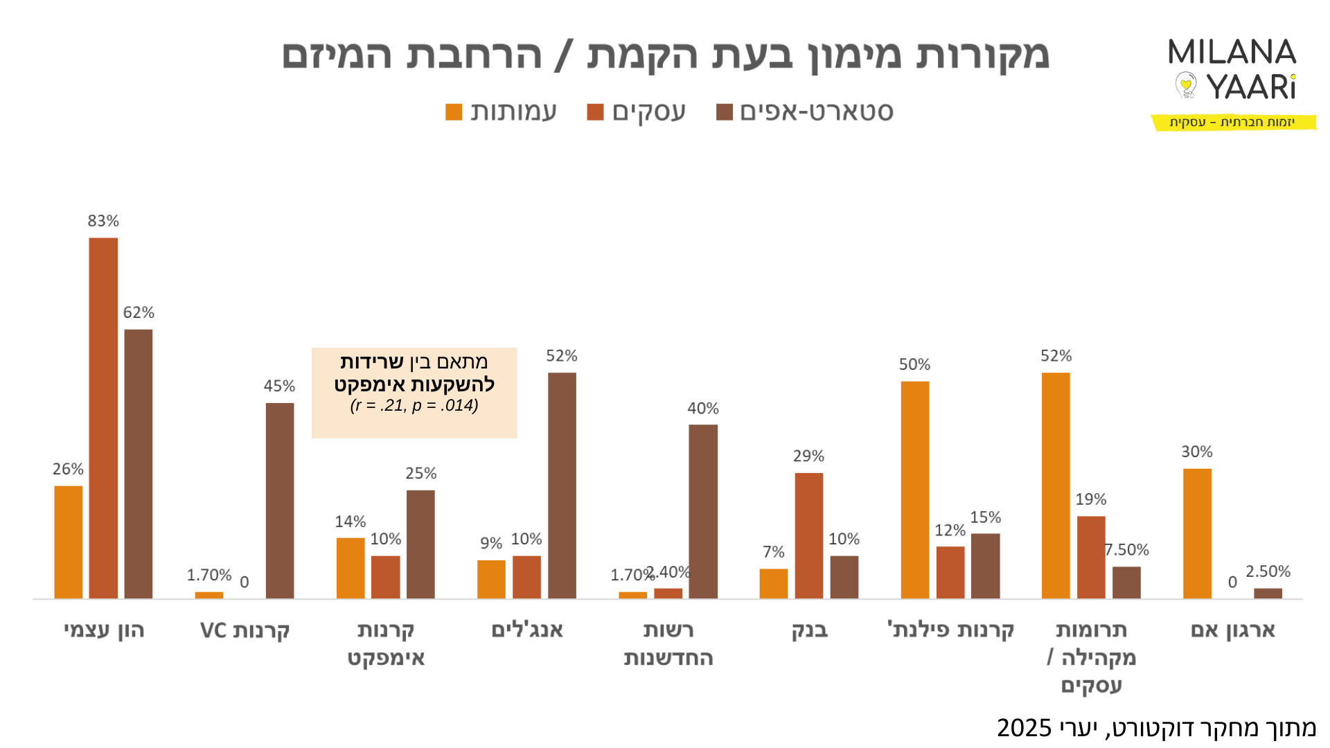 כפי שניתן לראות בגרף, מכל גורמי מימון - עסקיים, ממשלתיים ופילנתרופיים, רק מיזמים שקיבלו מימון מקרנות אימפקט בשלב ההקמה או ההרחבה הציגו מתאם מובהק עם שרידות המיזמים (r = 0.21, p = 0.01).